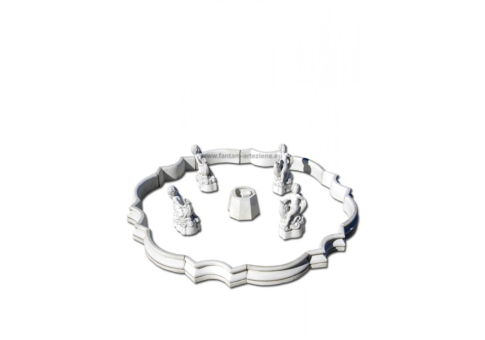 Un bazin de dimensiuni colosale, este conceput sa impresioneze prin maretie si eleganta celor patru statui amplasate proportional in interiorul acestiuia, acesta este luxosul bazin regal. Alcatuit din 12 segmenti si 4 statete care simbolizeaza un copil calarind un peste peste valuri involburate. Pentru montaj va trebui turnata o placa de sustinere care are si rol de fund al bazinuluui. Pentru lipirea segmentiolor de aceasta placa se va folosi o compozite speciala de ciment, testata cu succes de noi, pentru a nu pierde apa din bazin. Aceasta reteta se va regasi pe DVD-ul cu instruciunile de montaj si daca se va respecta intocmai reteta nu va mai fi nevoie de alte solutii impermeabilizare.